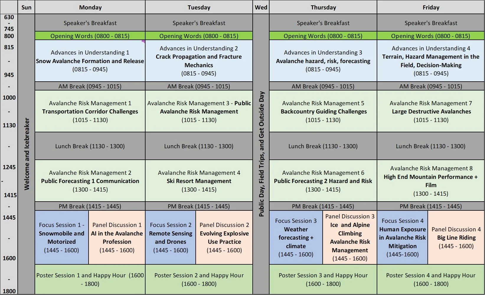 We have created a draft of a dynamic technical program that builds on successful past conferences, highlights emerging areas of practice, and incorporates new scientific discoveries. The program was designed with the overarching goal of merging theory and practice, and it attempts to achieve this objective through focusing some of the session on avalanche risk management themes.